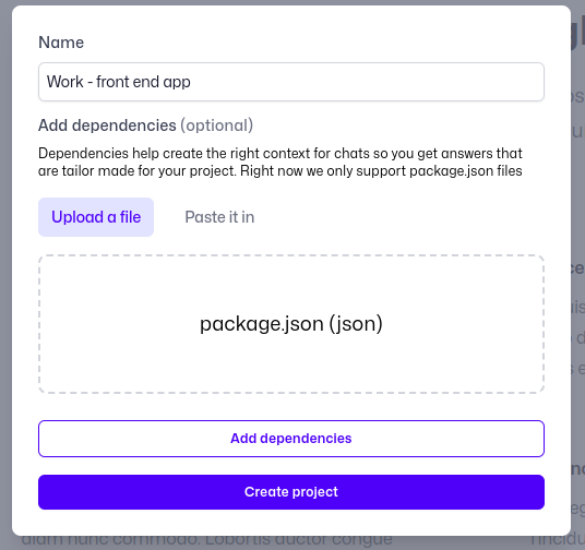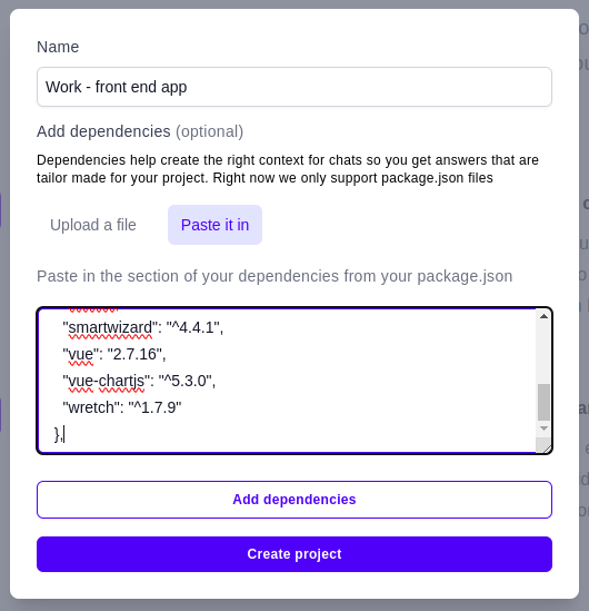 The dependencies of a project is the simplest and safest way to add context to a chat without sharing the actual code base.